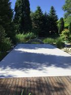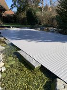 Eine weitere raffinierte Designentscheidung bestand darin, die Anlage so zu gestalten, dass sie bei Bedarf diskret unter einem eleganten Holzsteg verschwindet. Diese Möglichkeit bietet nicht nur eine ästhetisch ansprechende Lösung, sondern sorgt auch dafür, dass die Abdeckung bei Nichtgebrauch nicht störend in Erscheinung tritt, sondern nahtlos in die umgebende Landschaft integriert ist.